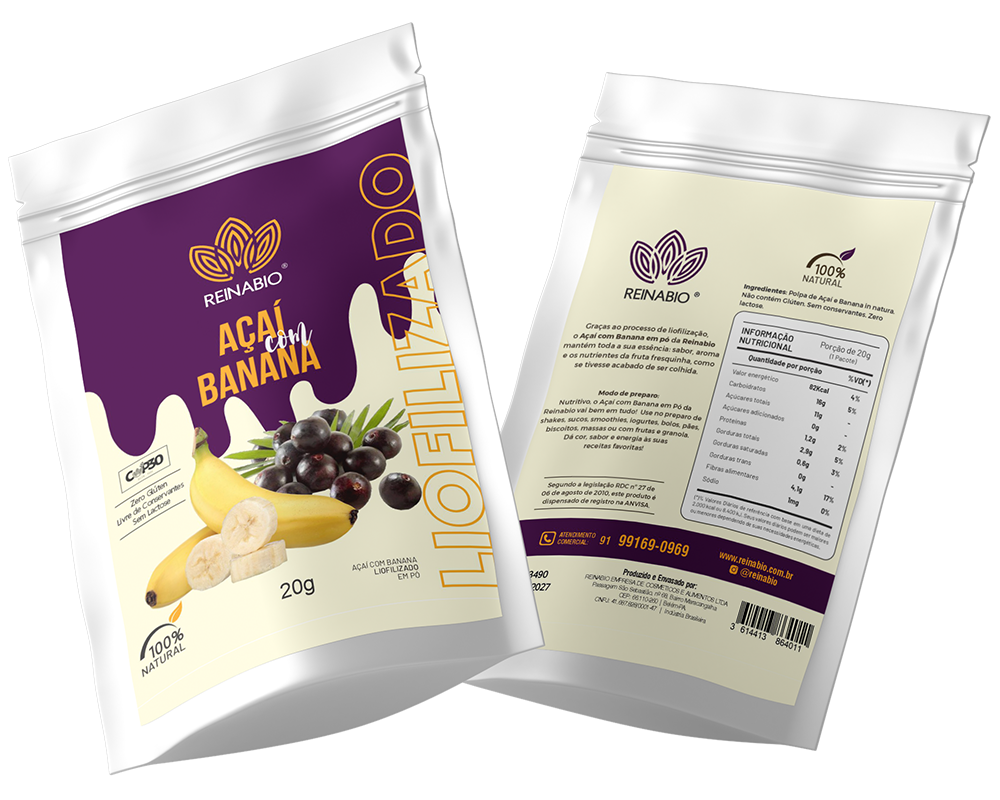 Graças ao processo de liofilização, os snacks de Açaí com Banana da Reinabio mantém toda a sua essência: sabor, aroma e os nutrientes da fruta fresquinha, como se tivesse acabado de ser colhida.